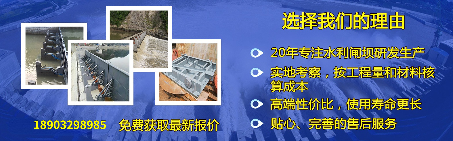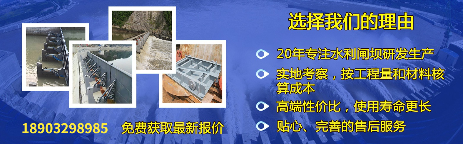 | 鋼壩 液壓壩 翻板閘門 液壓啟閉機 格柵除污機 抓斗清污機 液壓沖洗門 拍門 水利鋼閘門 鑄鐵閘門 液動下開堰門 旋轉堰門 合頁壩系列 螺桿 卷揚啟閉機 船閘人字門 一字門 閘閥 球閥 浮筒閥 |